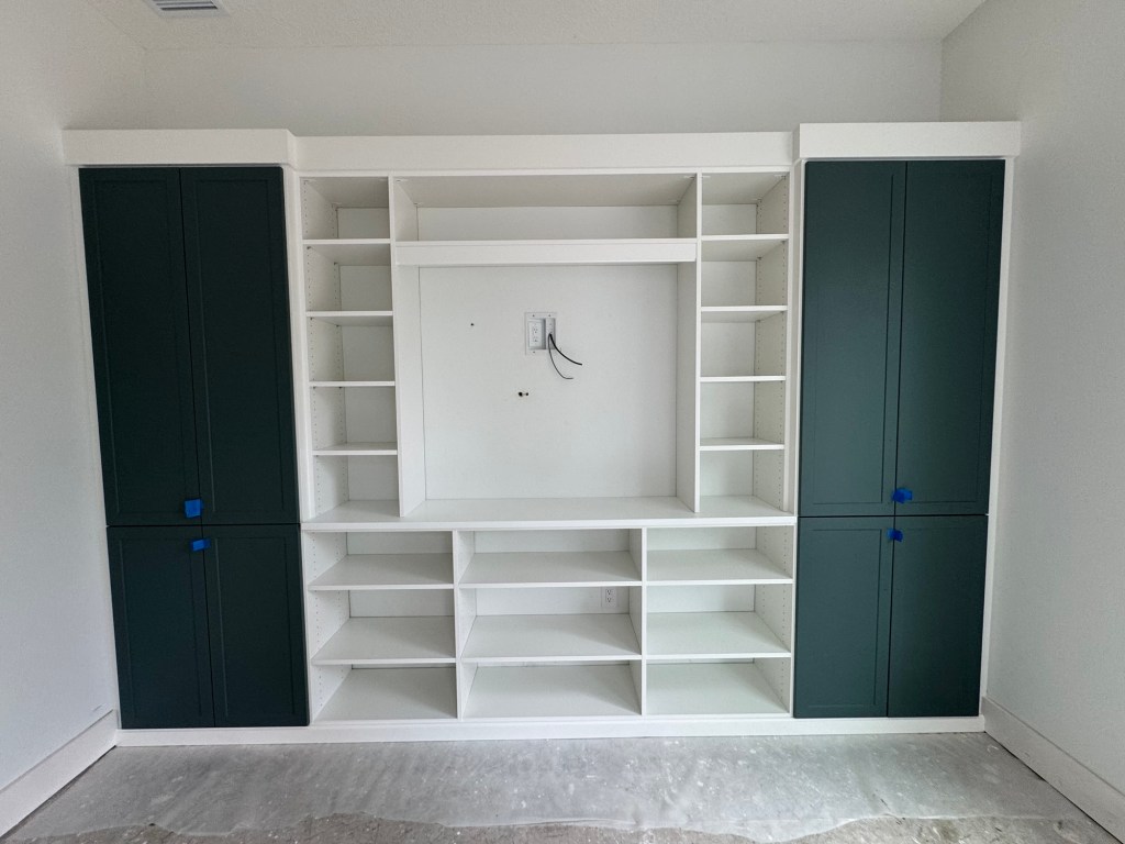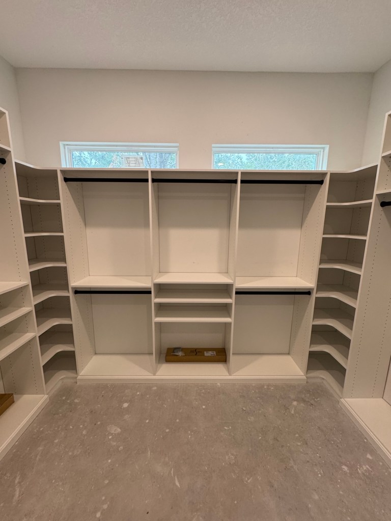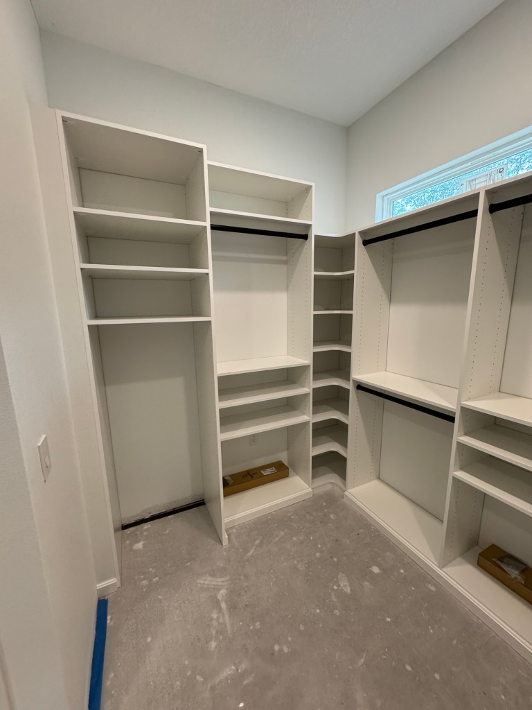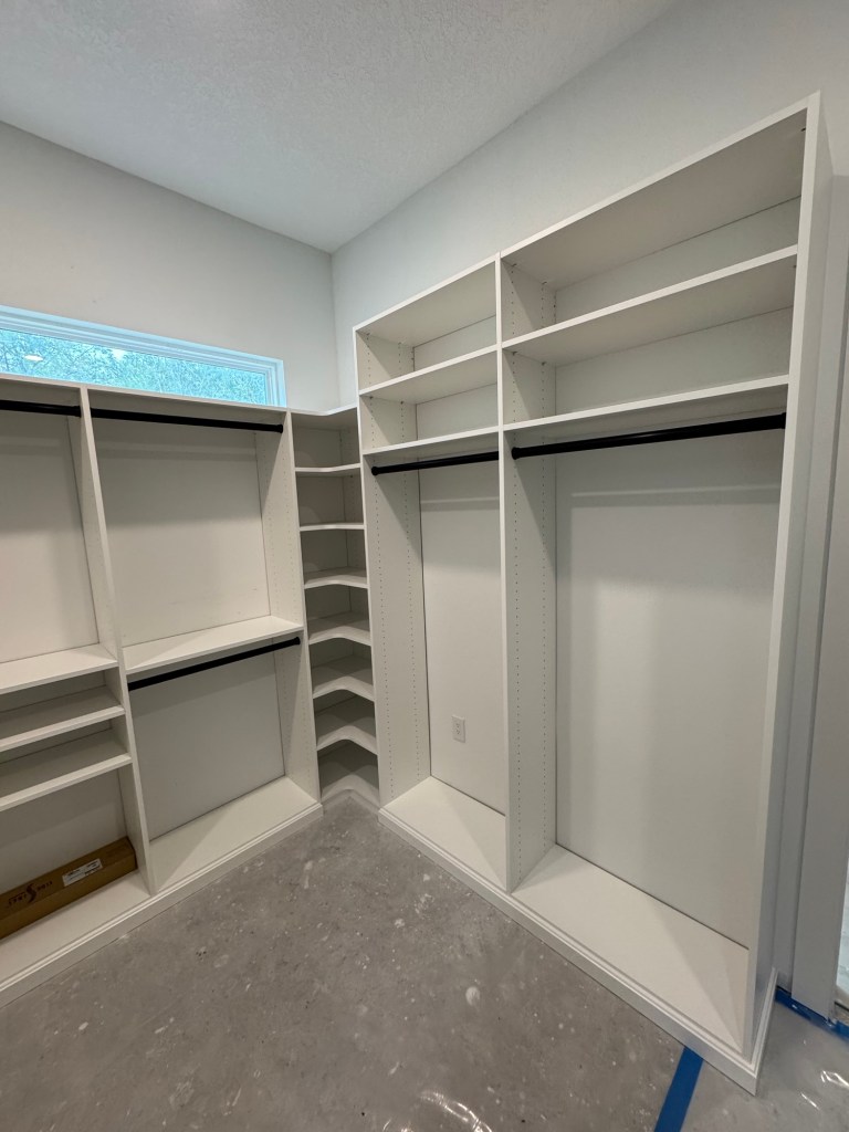 Closet installation in a new house build. Primary (Master) walk in closet as well as a playroom entertainment/book center.
